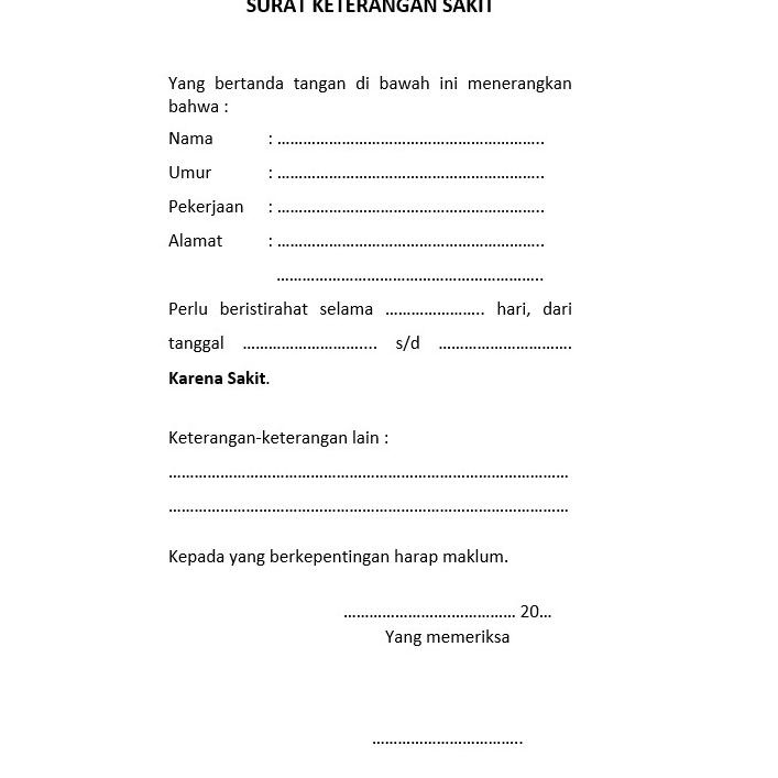 Nah, biasanya pihak yang membuat surat keterangan sakit tersebut adalah dokter atau klinik. Seperti apa surat keterangan sakit dari klinik, puskesmas maupun dokter rumah sakit yang asli dan resmi? Mari kita temukan jawabannya bersama . Karena surate keterangan sakit dari rumah sakit dari puskesmas itu harus ditulis di kertas dan ditandangani oleh dokter yang merawat/ memeriksa. Setiap dokter dan dokter gigi yang memiliki surat tanda registrasi diberikan wewenang untuk mengeluarkan surat keterangan sakit. Saya menyatakan dengan sesungguhnya bahwa saya telah memeriksa penyakit/luka yang . Surat keterangan dokter (physician form). Jika anda sedang dalam kondisi sakit, maka tentu anda akan berusaha pergi ke dokter ataupun . Dokter pemeriksa di rumah menerangkan bahwa. Dokter pengujitersendiri pada rumah sakit umum daerah prof.dr. Surat keterangan sakit memiliki format tersendiri . Johannes kupang di kupang, dalam hal ini menjalankan tugasnya dengan mengingat sumpah . Apabila besok kondisi badan masih belum baik, saya akan melampirkan surat keterangan sakit dari dokter atau hasil pemeriksaan dokter dan saya .