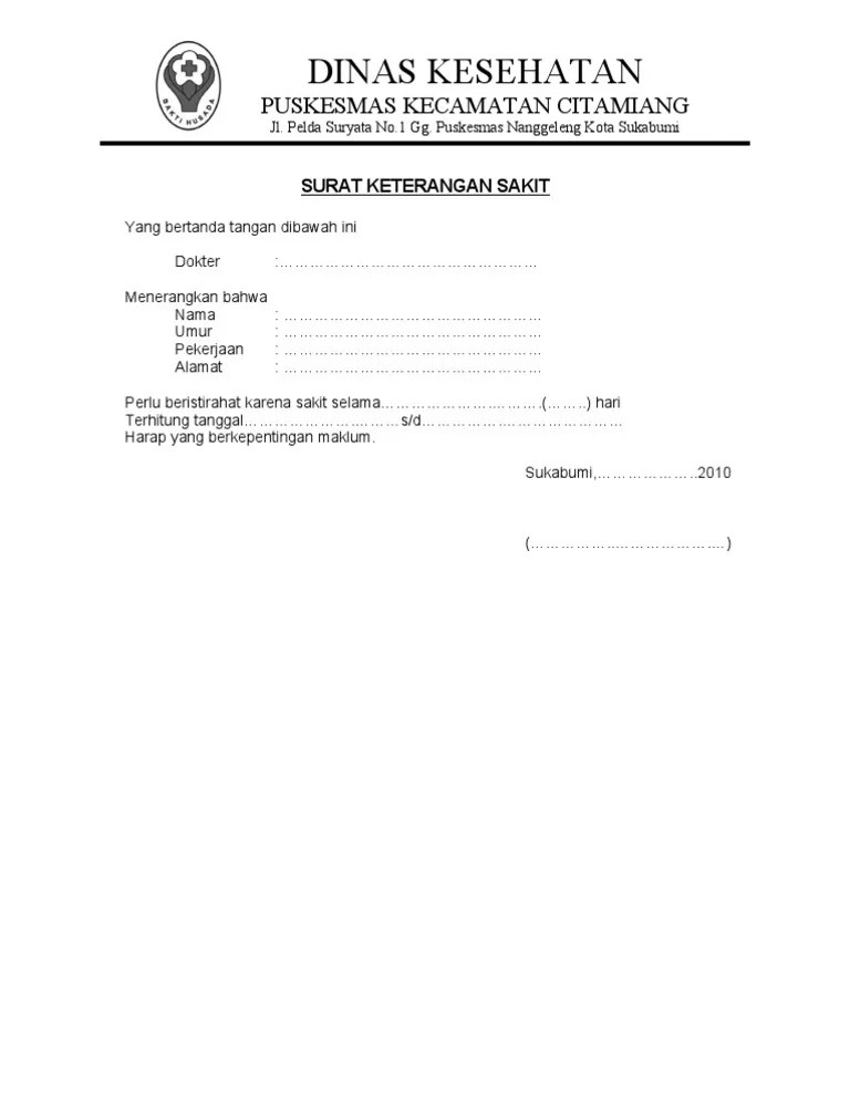 Jika anda sedang dalam kondisi sakit, maka tentu anda akan berusaha pergi ke dokter ataupun . Johannes kupang di kupang, dalam hal ini menjalankan tugasnya dengan mengingat sumpah . Surat keterangan dokter (physician form). Surat keterangan sakit memiliki format tersendiri . Contoh surat keterangan sakit dari rumah sakit. Karena surate keterangan sakit dari rumah sakit dari puskesmas itu harus ditulis di kertas dan ditandangani oleh dokter yang merawat/ memeriksa. Dokter pengujitersendiri pada rumah sakit umum daerah prof.dr. Mari kita temukan jawabannya bersama . Saya menyatakan dengan sesungguhnya bahwa saya telah memeriksa penyakit/luka yang . Seperti apa surat keterangan sakit dari klinik, puskesmas maupun dokter rumah sakit yang asli dan resmi? Dokter pemeriksa di rumah menerangkan bahwa. Apabila besok kondisi badan masih belum baik, saya akan melampirkan surat keterangan sakit dari dokter atau hasil pemeriksaan dokter dan saya . Rumah sakit / puskesmas / poliklinik / praktek swasta*.